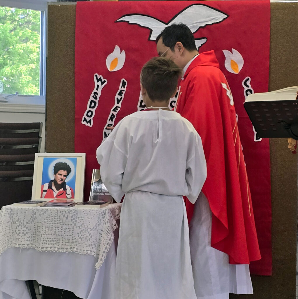 Fr. Arnold Bolima blesses items about Blessed Carlo Acutis on Pentecost Sunday 2025.